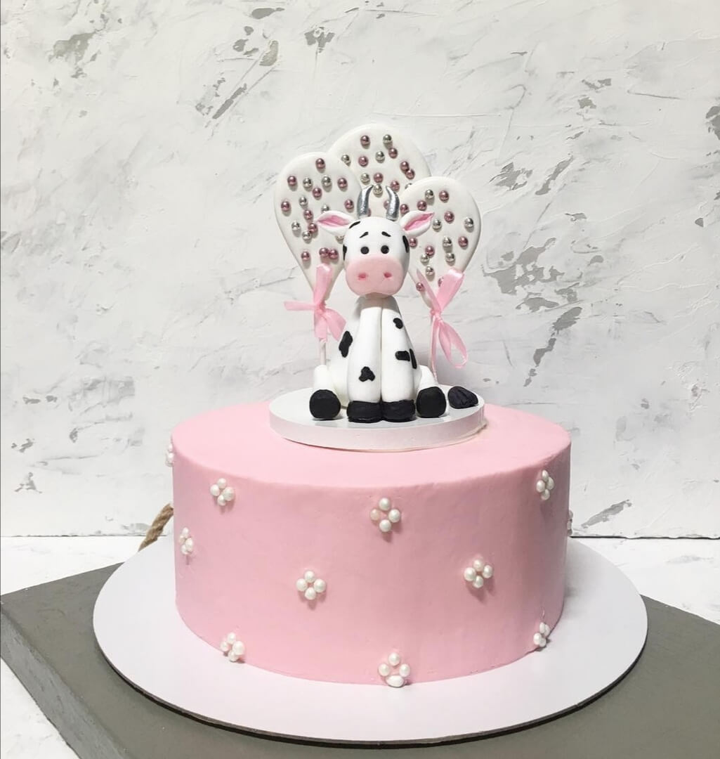 Обаятельная коровка с воздушными шариками создает нежный дизайн для поздравительного тортика самым маленьким именинникам