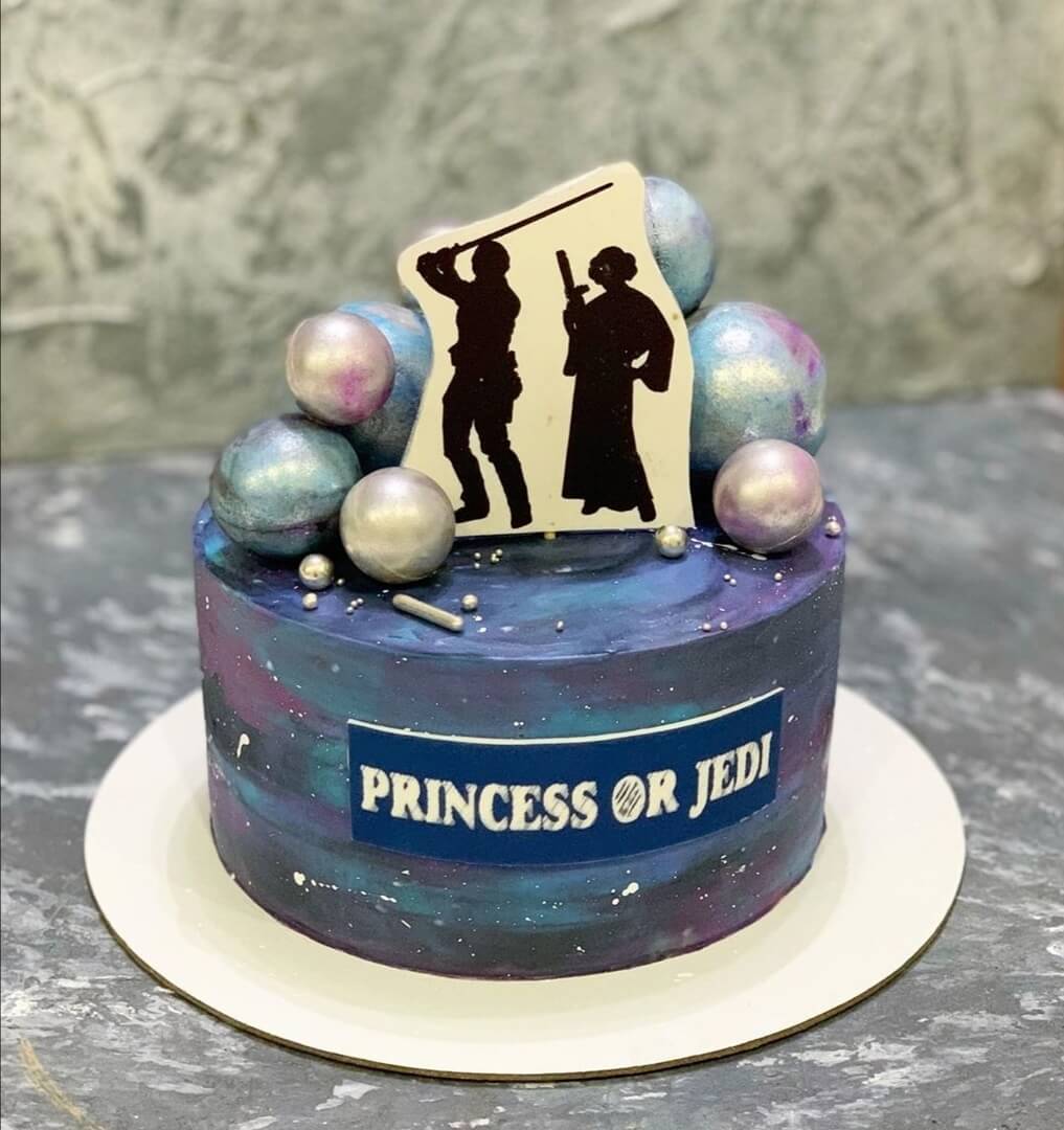 Гендерный торт на определение пола будущего ребенка в стиле звездных войн с культовыми персонажами ЗВ - Люком и Леей.